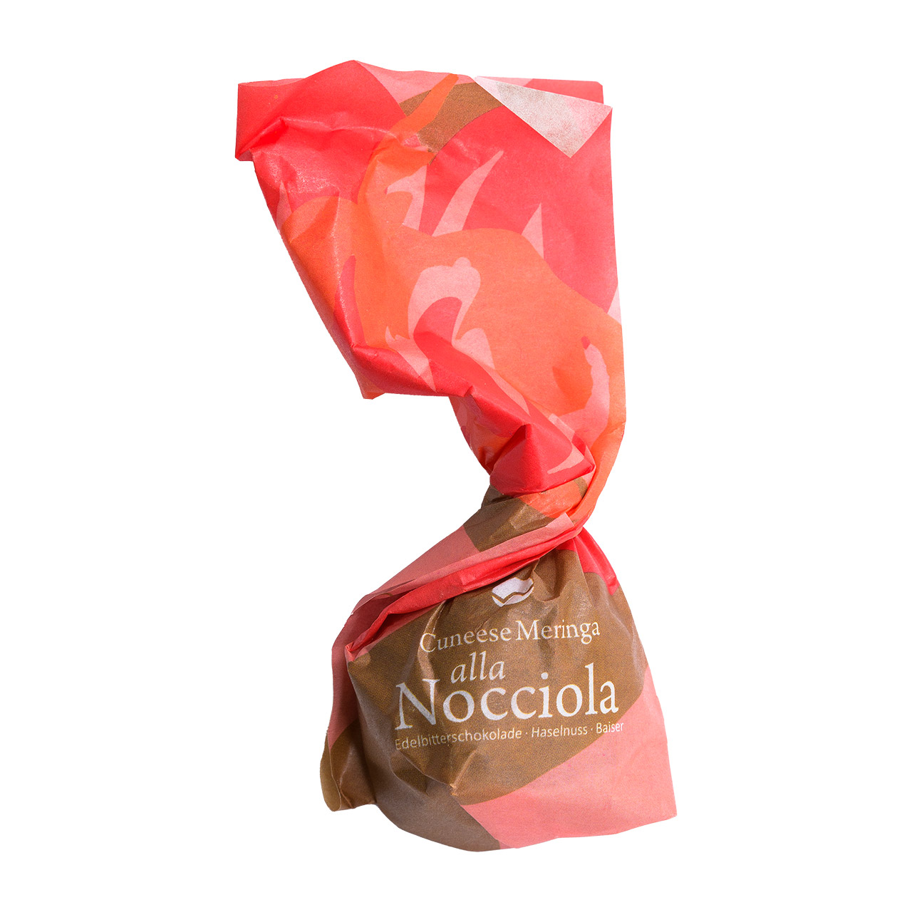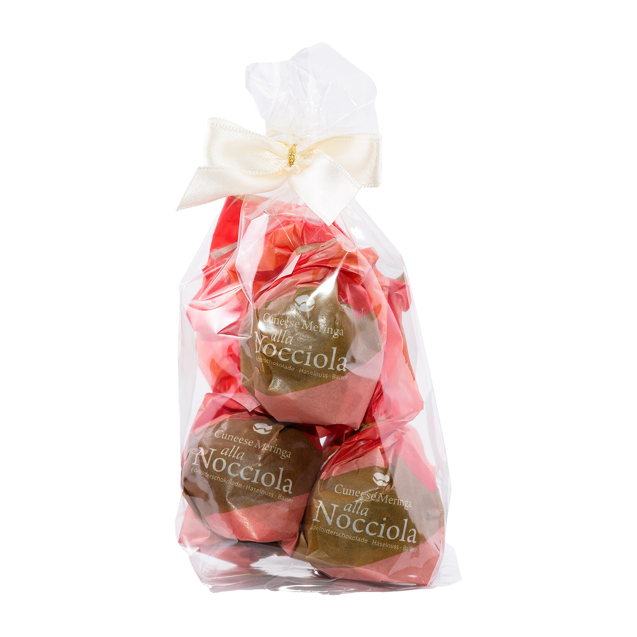 Fünf Stück der einzeln verpackten, großen Pralinen von Tutto Cioccolato füllen wir für dich in ein Tütchen mit Schleife. So kannst Du die Cuneesi con meringa alla nocciola, die dunkle Variante der Tutto Cioccolato Praline, verschenken oder sie selbst genießen.