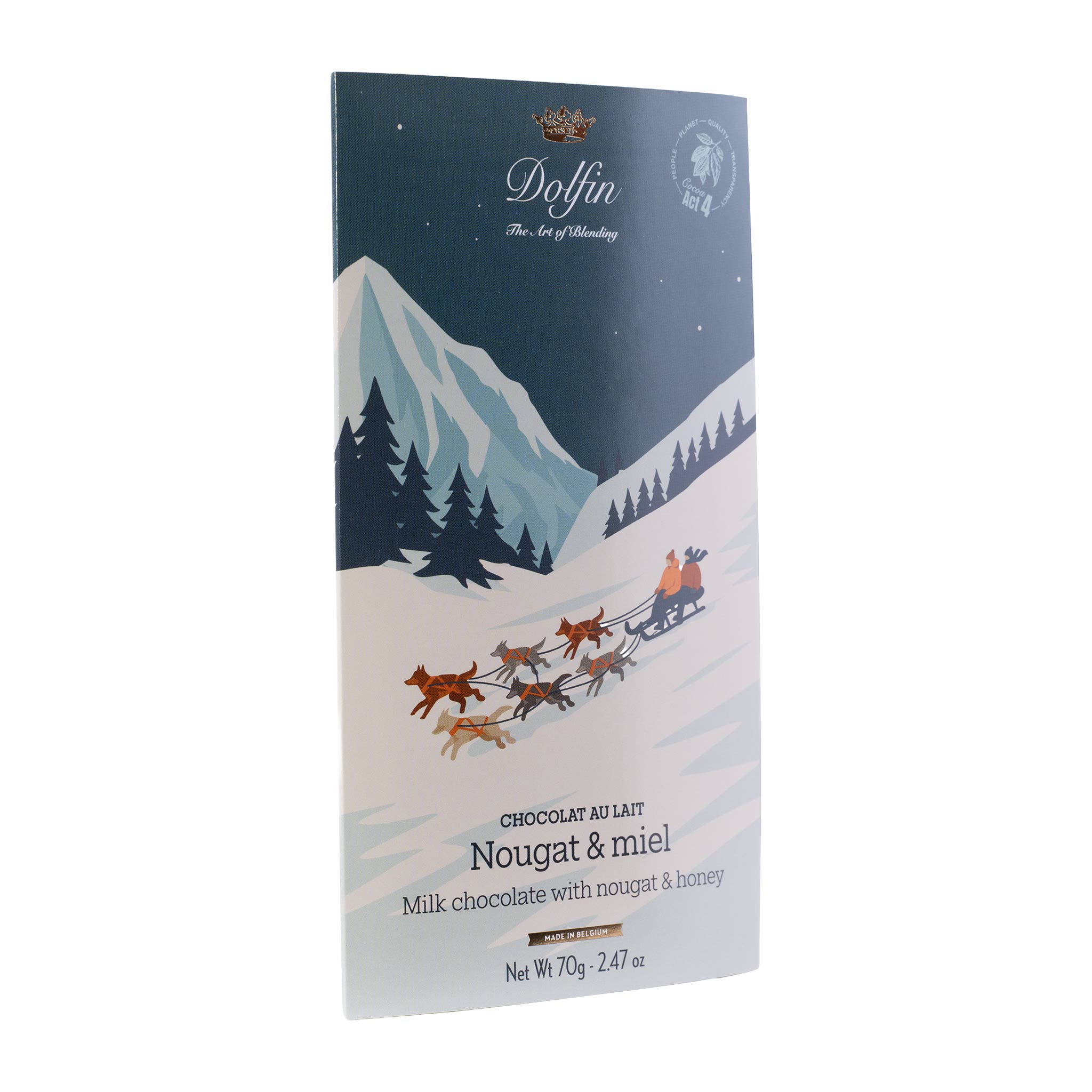 Entdecke mit der Dolfin Milchschokolade mit Nougat und Honig eine winterliche Schokolade aus Belgien – cremig, zart & perfekt zum Verschenken.