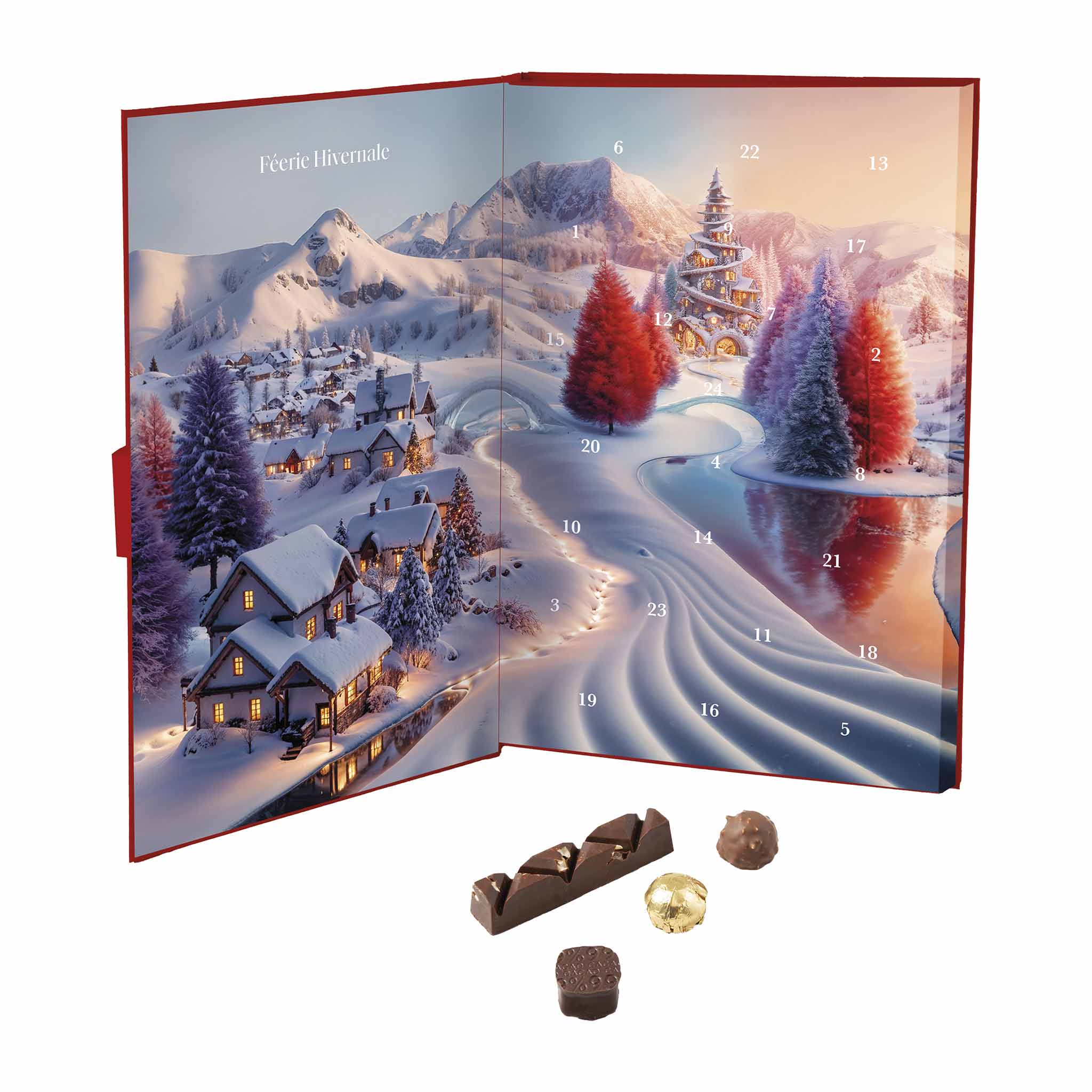Tauche ein in ein geheimnisvolles Dorf unter goldenen Himmeln: In 24 liebevoll gestalteten Fenstern verbergen sich süße Kostbarkeiten aus Zartbitter- und Vollmilchschokolade. Der Adventskalender Winterzauber von Cluizel begleitet dich mit cremigen Ganaches und zarten Pralinés durch die Vorweihnachtszeit. Jede Kostprobe reflektiert das Können der Manufaktur und die Reinheit ihrer Zutaten. Freue dich auf tägliche Genussmomente, die dich das ganze Dezember-Monat über begeistern.